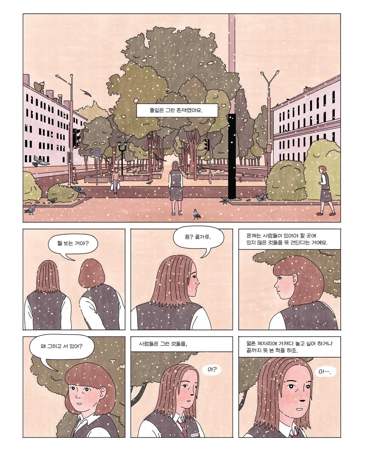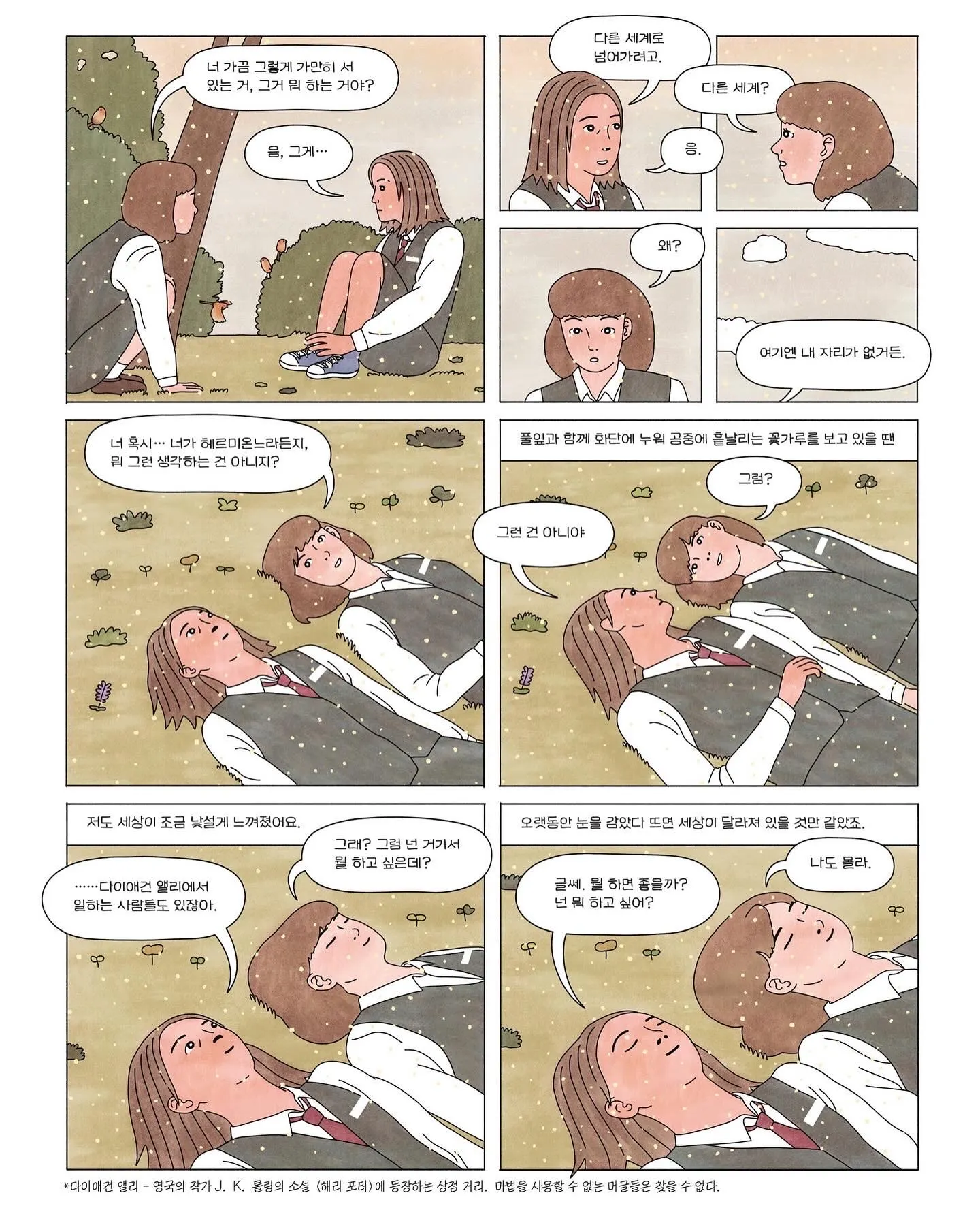 전 오래전부터 다른 세계가 있다고 믿었어요. 왜냐면 그곳이 원래 제가 있어야 할 곳이니까요. 다른 세계는 어떤 곳일까? 얼마나 아름다울까? 상상했어요. 하지만 문제는 문이었죠. 다른 세계로 넘어가는 문을 찾는 게 쉽지는 않았거든요. 그날도 평소처럼 괜히 힘껏 문을 밀었어요. 그리고 문을 열면서 깨달았어요. 그토록 바라던 다른 세계에 이미 도착했다는 걸요. _곽풀잎