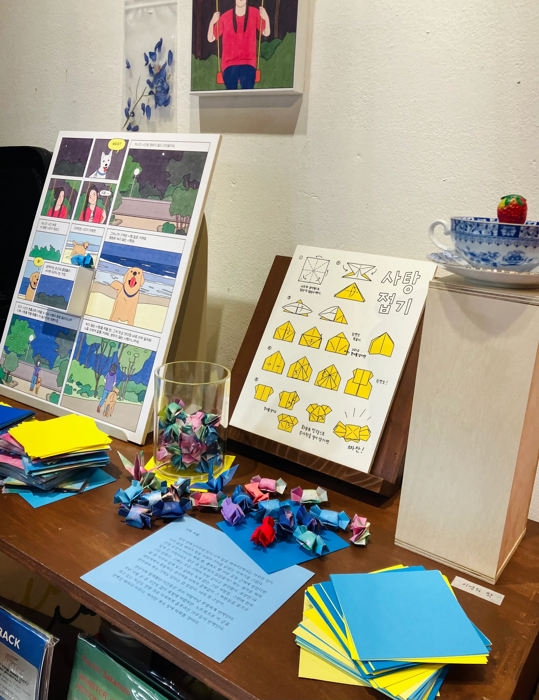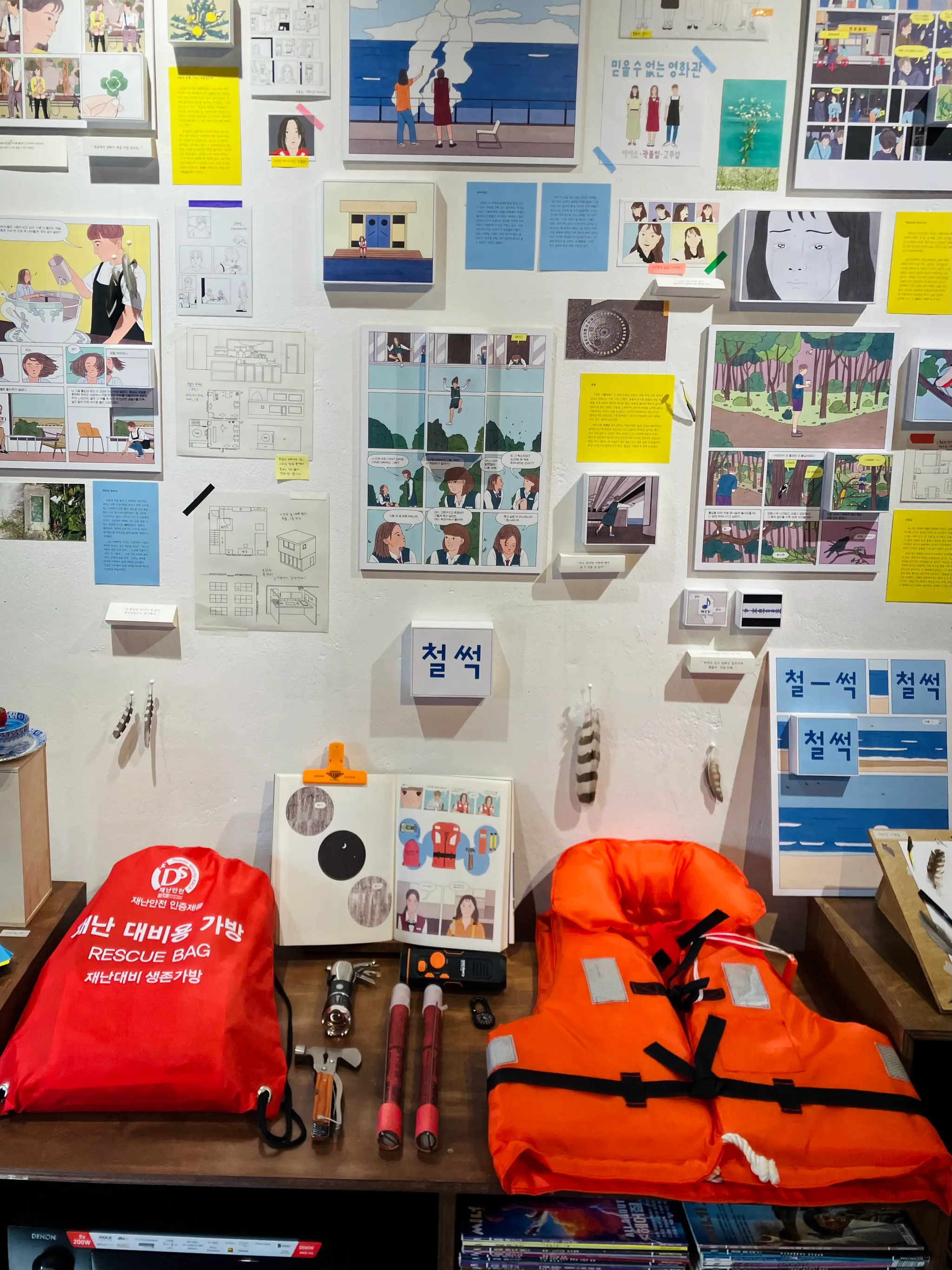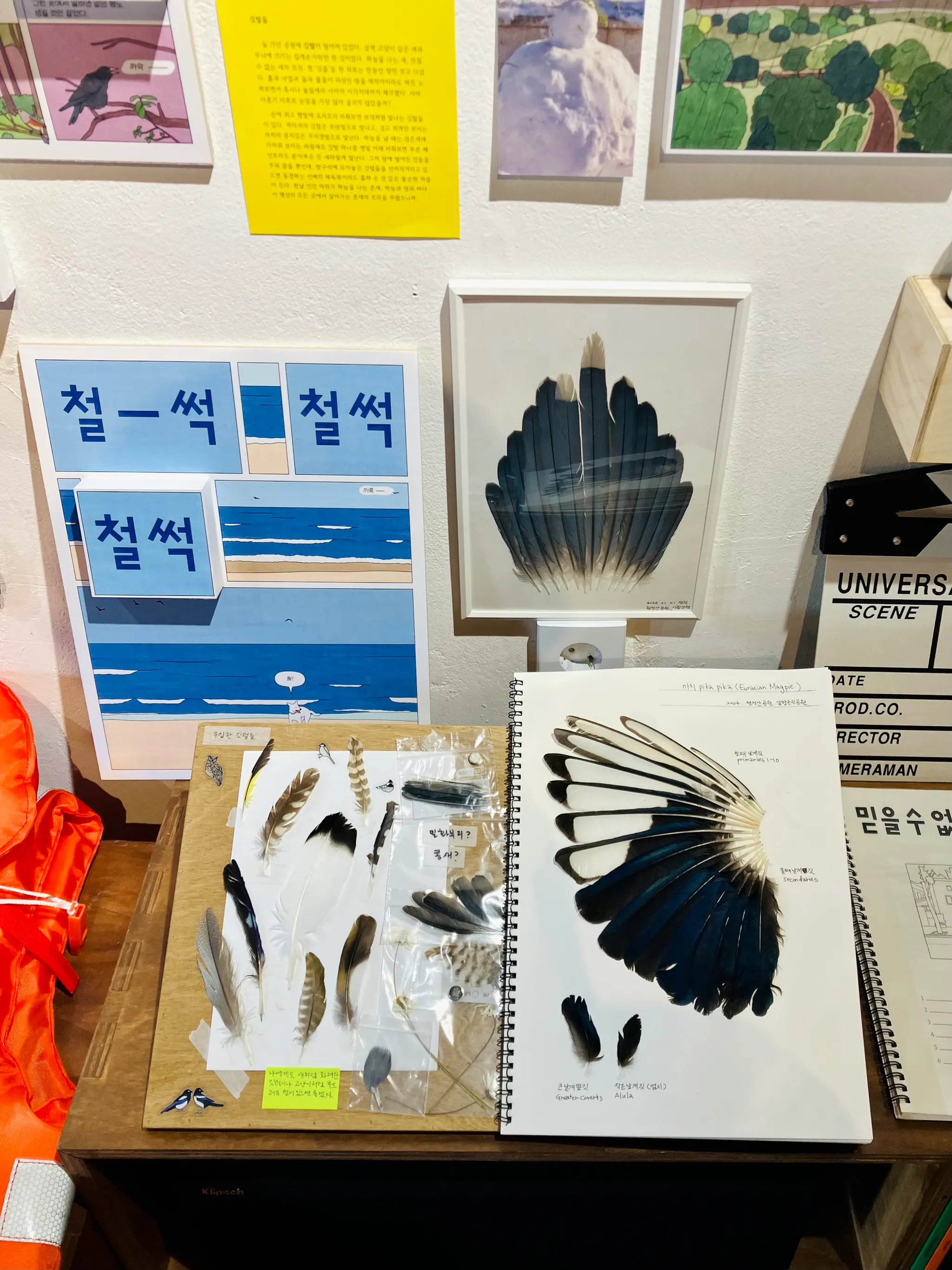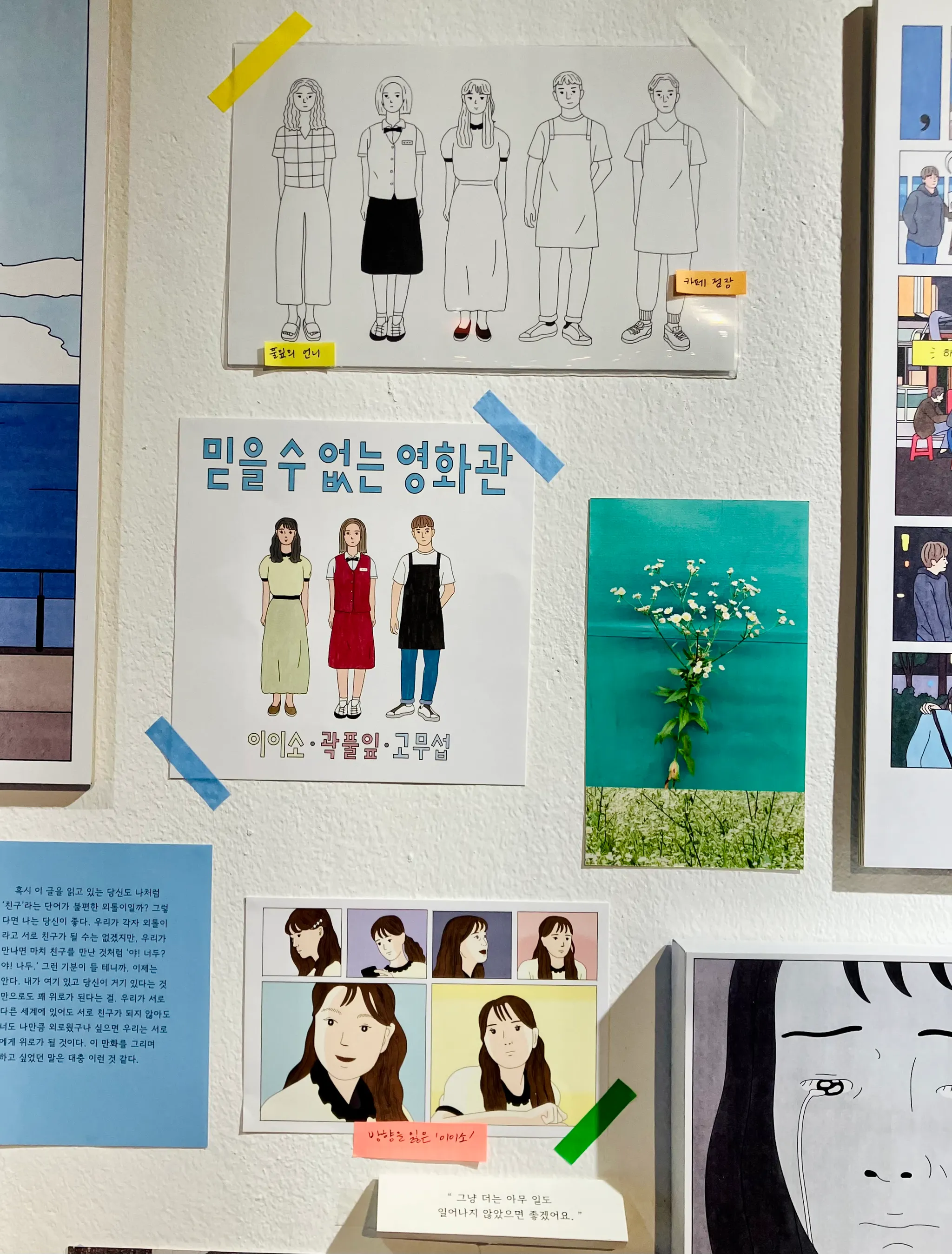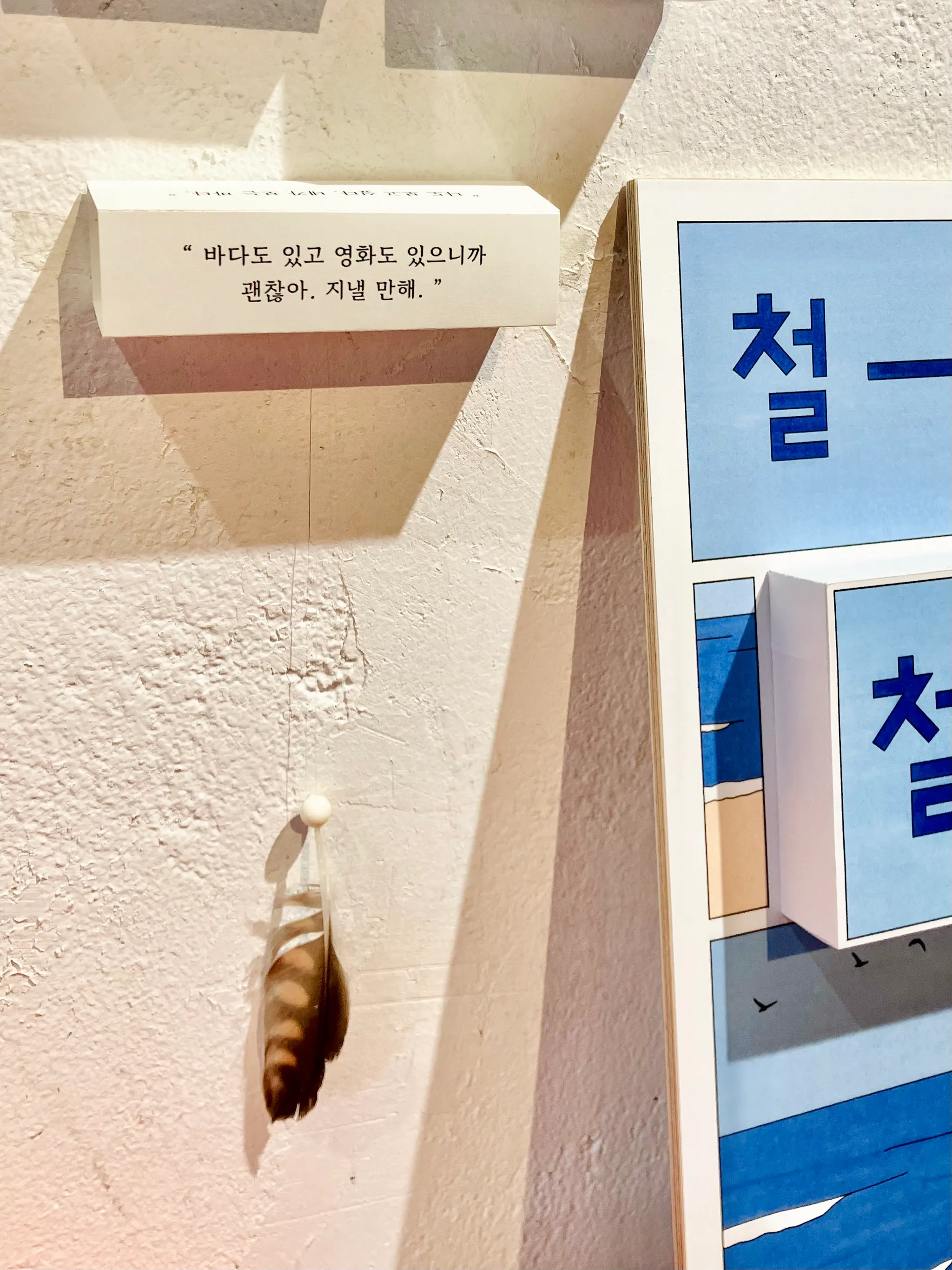 '믿을 수 없는 동쪽의 영화관'은 정동진 영화제가 열리는 2025년 여름, 동쪽의 비밀 같은 공간 '이스트씨네'에서 열린 전시입니다. 만화 원본 크기의 그림과 콘티, 러프 스케치, 작업 노트, 시나리오 등의 작업 과정부터 만화 속 장면과 얽힌 못다 한 이야기와 만화 속 오브제들, 그리고 수집한 깃털들까지. '믿을 수 없는 영화관' 처럼 바닷가 앞에 우뚝 선 이스트씨네에서 푸른 바다와 무더운 여름, 영화와 책을 모두 즐길 수 있었던 전시입니다.