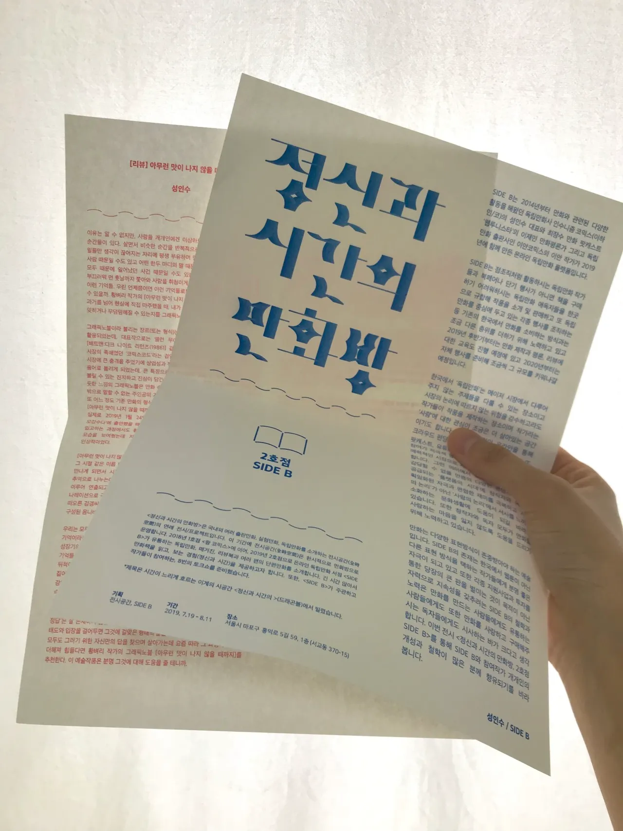 <정신과 시간의 만화방>은 국내외 여러 출판만화, 실험만화, 독립만화를 소개하는 전시공간(全時空間)의 연례 전시/프로젝트입니다. 이 기간에 전시공간(全時空間)은 한시적으로 만화방으로 운영합니다. 2018년 1호점 <쾅 코믹스>에 이어, 2019년 2호점으로 온라인 독립만화 서점 <SIDE B>가 유통하는 독립만화, 매거진, 리뷰북과 여러 편의 단편만화를 소개합니다. 긴 시간 앉아서 만화책을 읽고, 보는 경험(정신과 시간)을 제공합니다.
